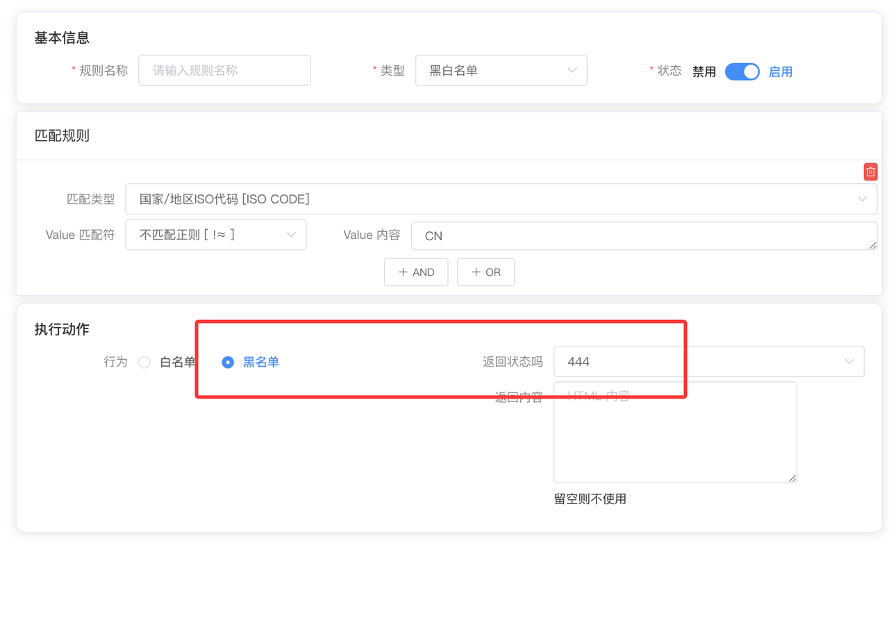 黑名单的拦截效率是最高,可设置为黑名单返回444状态码(优先放在规则第一位)