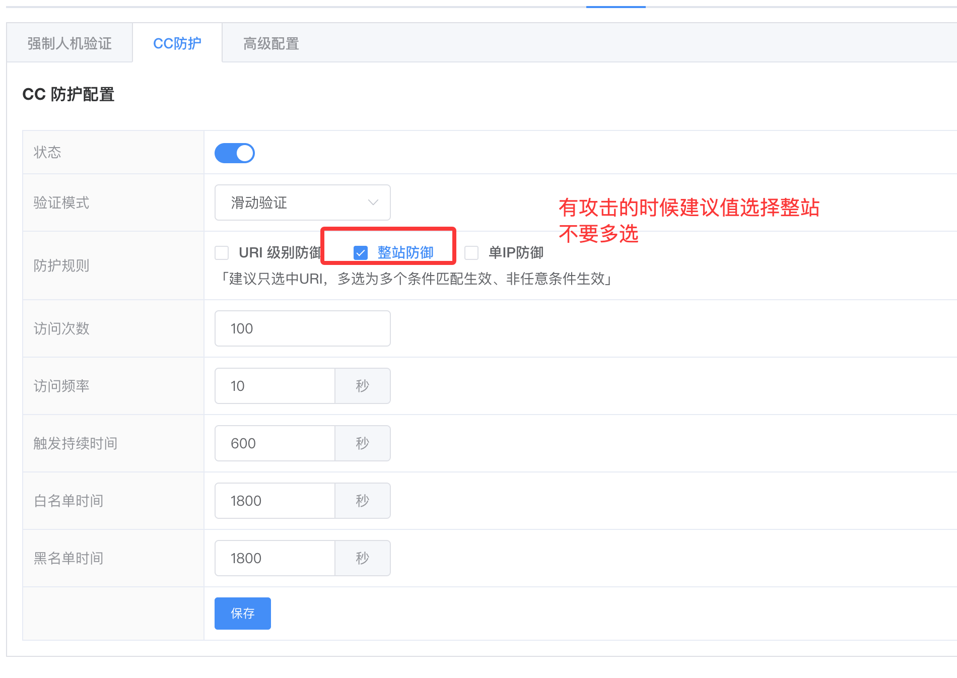 如果攻击不是很大的情况,可以使用自带的强制人机验证或者CC防御