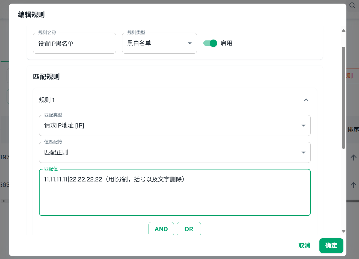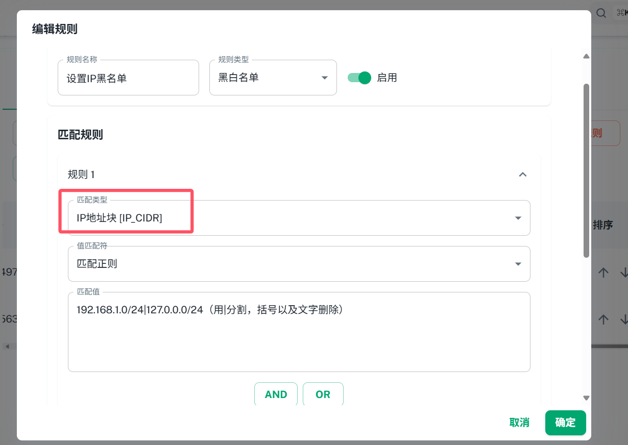 匹配值:如:192.168.1.0/24|102.168.1.0/24(用|分割,括号以及文字删除)